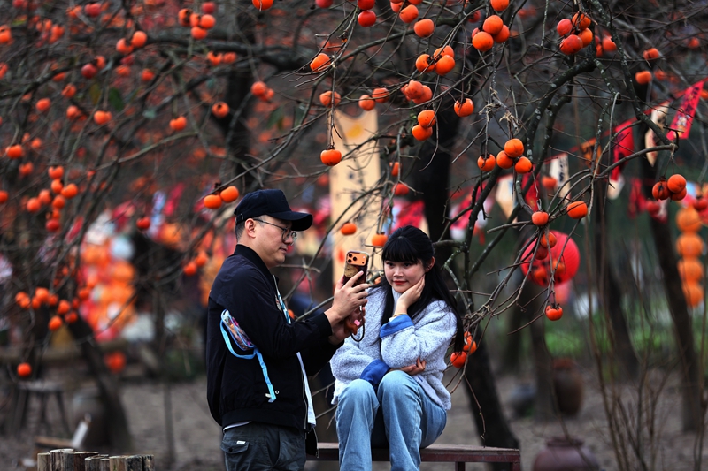 图为游客在四川省乐山市五通桥区汤家坝村柿子园游玩。