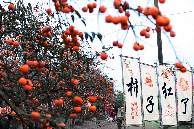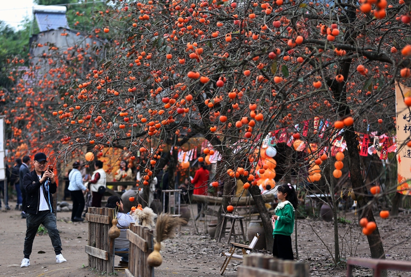 11月17日,四川省乐山市五通桥区汤家坝村柿子园,柿子树上挂满红彤彤的柿子,成了小山村一道亮丽的风景线,吸引游客前来游玩,带动了当地乡村旅游发展。
