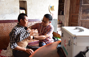 陈邦炎是名尘肺病患者,因病致贫后意志消沉。蒋冀知道后每隔几天就要去他家走访,每次去都要帮他听诊,了解身体情况,并根据病情及时和诊疗医生沟通。时间一长,陈邦炎对这位背着医药箱的第一书记放下心防,真诚相待,像和自己兄弟一样,倾诉苦恼、分享喜悦。“我不能辜负蒋书记的期望,一定好好治病!”在蒋冀的鼓励下,陈邦炎如今以十分积极的心态抗击着病魔。