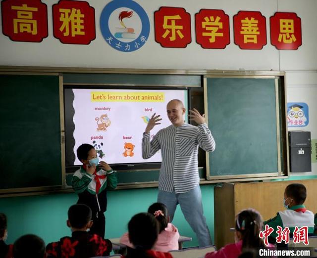 王峰与庆阳市外事办衔接开展外教老师乡村扶贫支教。图为彭阳村天士力小学外教老师上课时情景。 侯志雄 摄