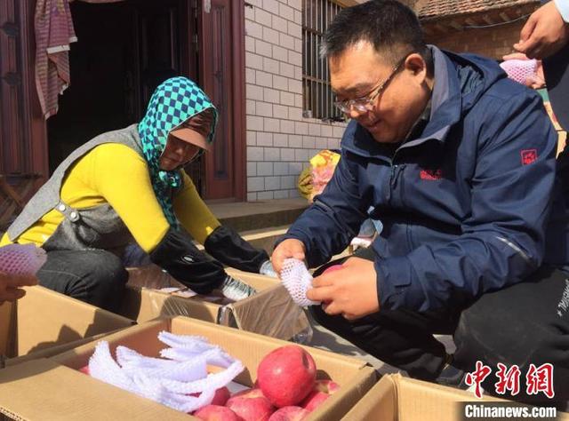 苹果产业是镇原县的富民脱贫产业。图为王峰与农户查看苹果收成。 侯志雄 摄