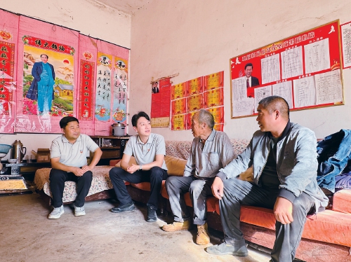 图为国务院研究室派驻淅川县蒿坪村第一书记水名岳(左二)带领村干部到监测户李天军(右二)家中入户走访,询问近期情况。受访者供图