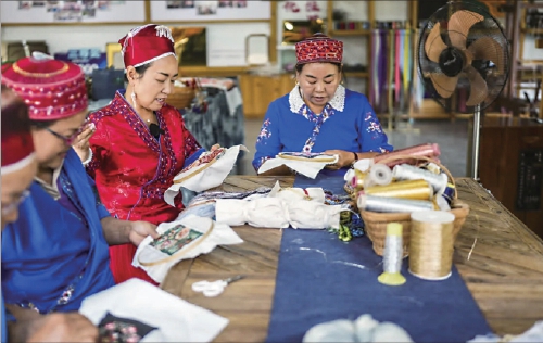 在位于贵州省施秉县的舞水云台非遗工坊内,龙禄颖(左三)带着当地脱贫群众进行刺绣创作。陶亮 摄