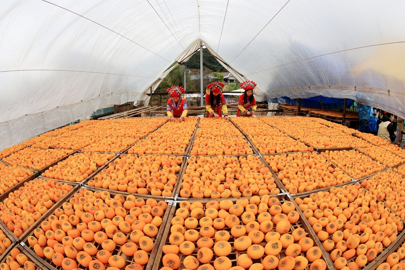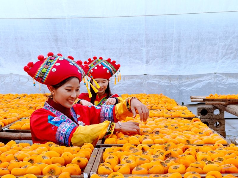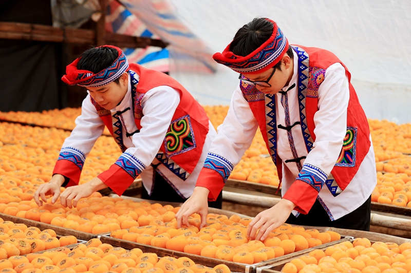 12月13日,广西桂林市平乐县桥亭乡显堆村“盛柿大塘”现代特色农业示范区内,身着民族盛装的青年向外界推介挂满枝头的柿子。进入冬季,广西桂林市平乐县柿子迎来丰收季,连片果园里,饱满的柿子压弯枝头,金黄透亮,与乡村景致相映成趣,构成一幅冬日丰收画卷。