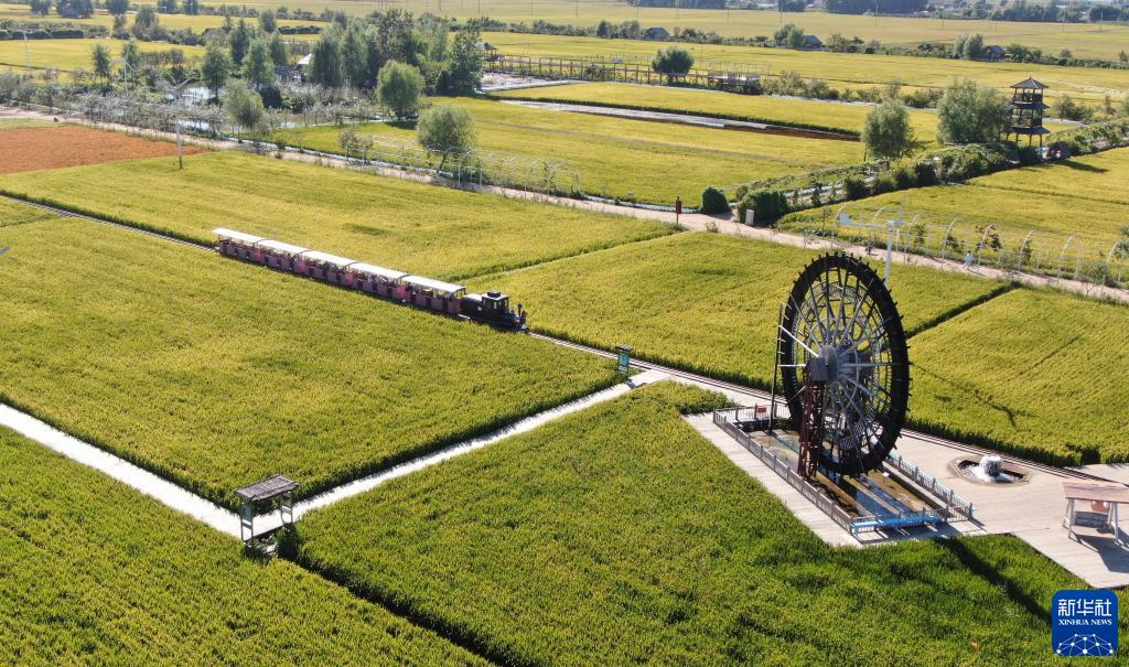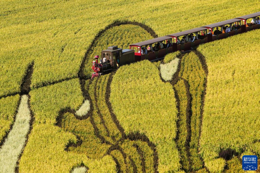 9月1日,游客在“稻梦空间”景区乘坐”小火车“游玩(无人机照片)。