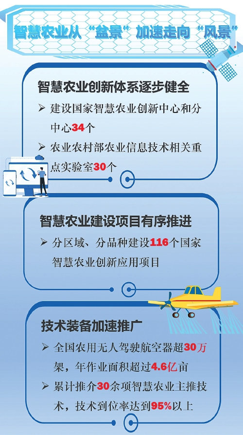 智慧化“新农具”得以在全国各地“生根开花”,离不开精准的示范推广与有力的政策扶持。我国分区域、分品种建设116个国家智慧农业创新应用项目,打造出一批可复制、可推广的“示范窗口”。稳定实施农机购置与应用补贴政策,推动技术装备加速走进田间地头。据统计,全国农用无人驾驶航空器已超30万架,年作业面积超过4.6亿亩;累计推介30余项智慧农业主推技术,技术到位率达95%以上,更多农户享受到科技红利。