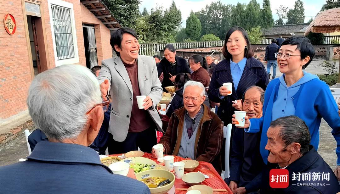重阳节聚餐现场,廖高平(左二)向单位同事介绍村里的老人。曾业 摄