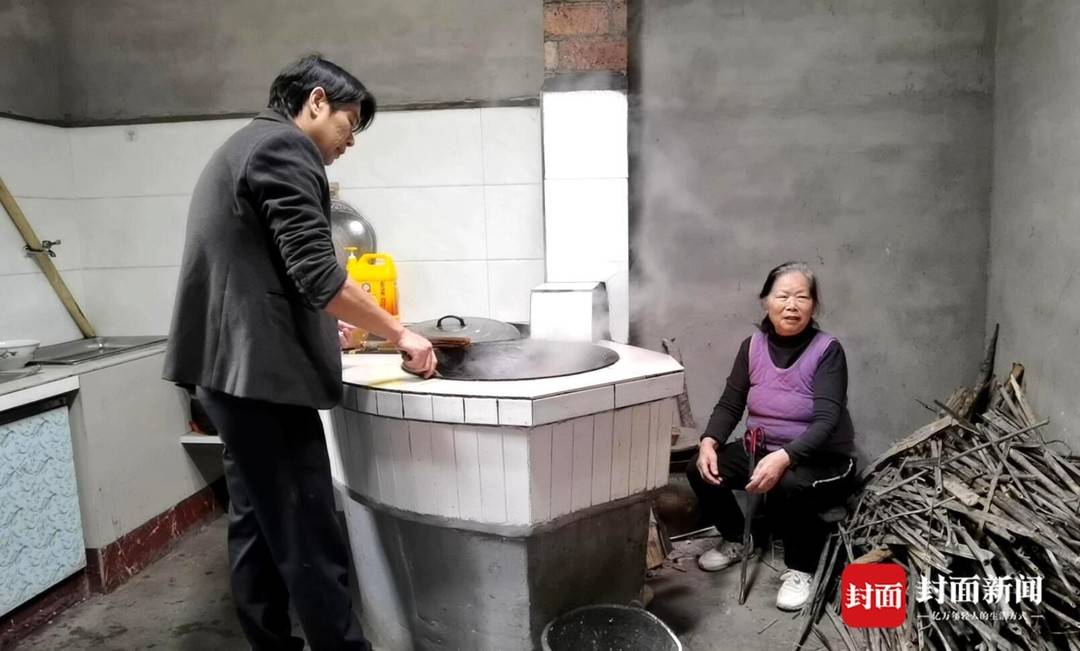 闲聊间,灶膛里的火苗舔着锅底,泡笋子片在沸腾的汤汁里翻滚。79岁的黎必才翻出珍藏的茶叶,用电水壶烧起开水招待客人,老伴则坐在厨房柴火灶前汆火,与站在灶台前“掌勺”的廖高平“打配合”。
