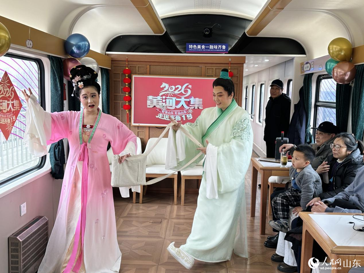 1月29日,非遗渔鼓戏在“齐鲁1号”车厢内精彩上演。人民网记者 乔姝摄
