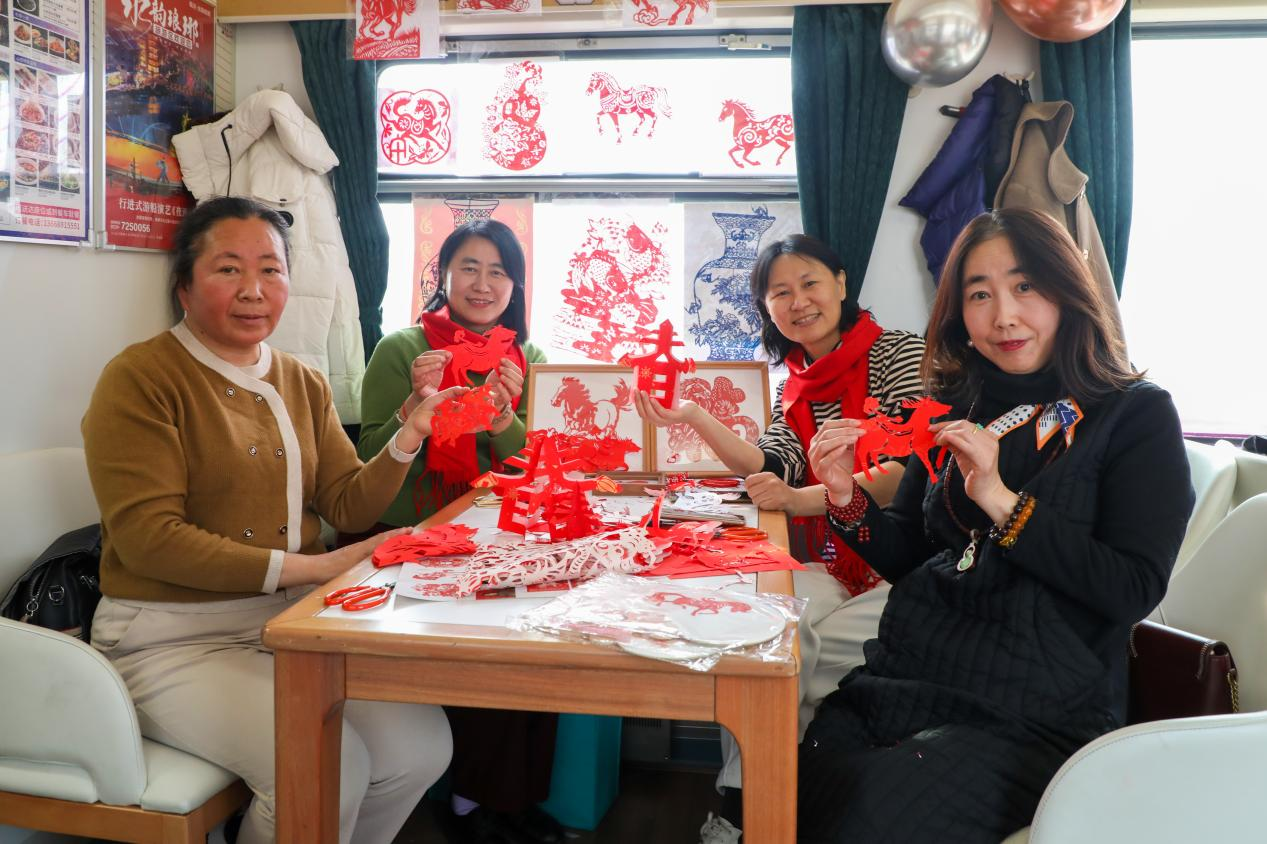 1月29日,乘客在“齐鲁1号·黄河大集”主题车厢体验凌氏剪纸。刘洋摄