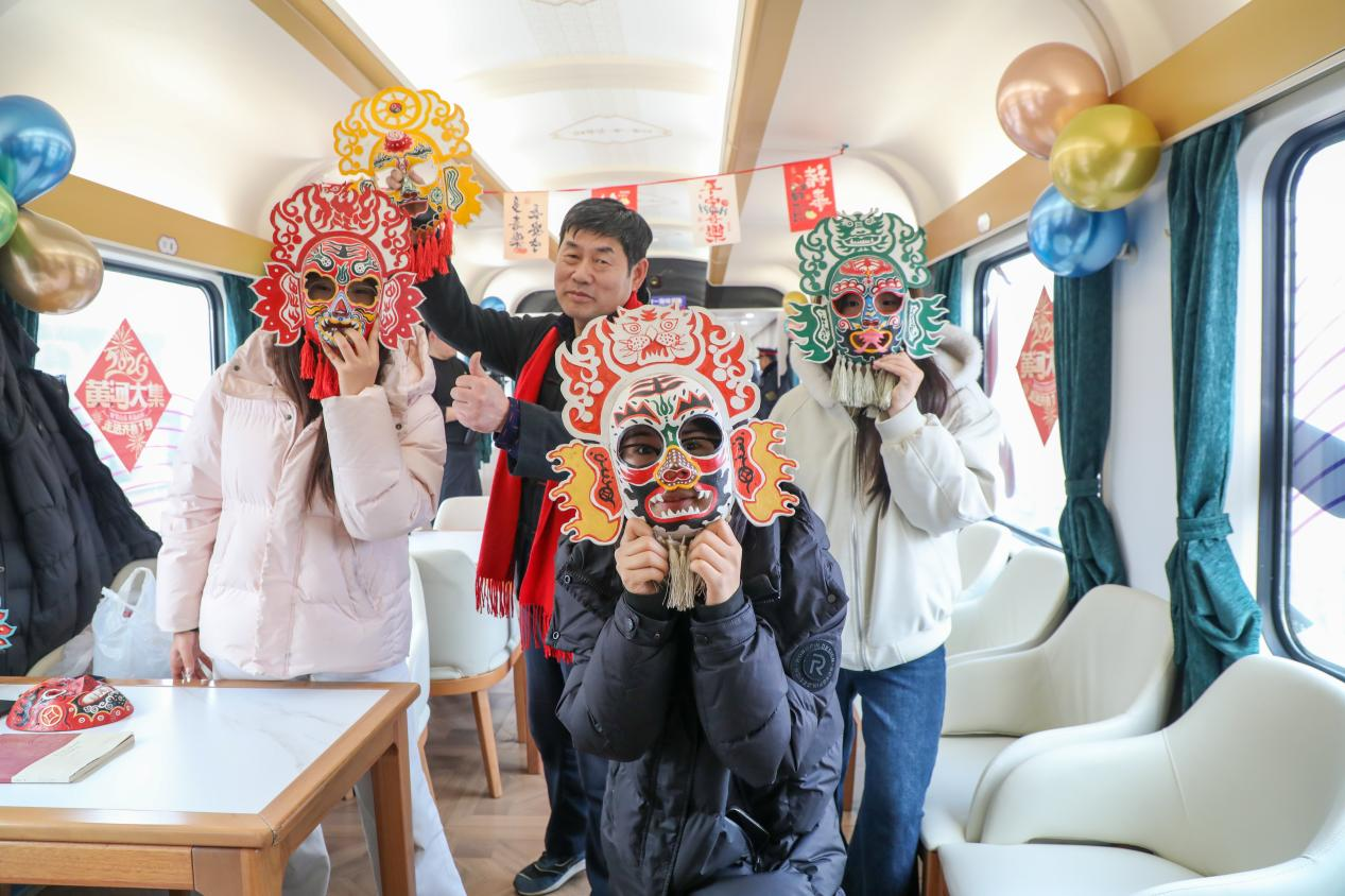 1月29日,在“齐鲁1号·黄河大集”主题车厢,乘客与侯氏社火脸谱代表性传承人侯志新(后排中)共同体验传统艺术魅力。刘洋摄