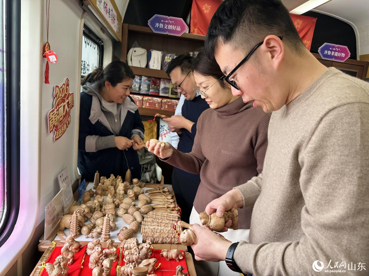 车厢内,非遗代表性传承人现场展示凌氏剪纸、社火脸谱、沾化渔鼓戏等技艺,让传统民俗与春运归途温暖相遇;沂蒙炒鸡、沂河鱼丸、桃木制品等农特产品整齐陈列,将齐鲁大地的丰饶与乡情一并打包;更有现场手写春联、福字等节礼,为返乡旅客送上真挚祝福。(乔姝、实习生王瑾瑄)