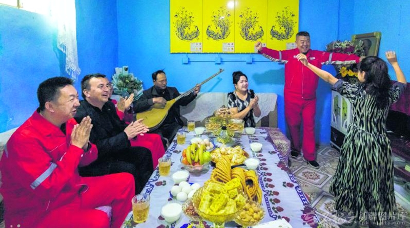 3月21日,中国石油新疆油田公司驻泽普县依克苏乡托万恰喀村工作队队员与村民欢聚一堂、共庆节日。张昀摄